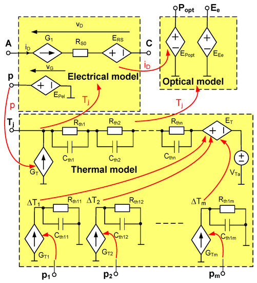 The terminals A and C represent the anode and the cathode of the modelled device, respectively. Using these terminals, the considered model can be connected to the other components occurring in the application circuit of this diode. The other terminals of the model (Tj, Popt, Ee, p, p1, p2, …, pm) do not correspond to the physical terminals of the power LED, and they are used to give information about the values of optical (Popt, Ee) and thermal (Tj) quantities of the modelled device and the electrical power dissipated in the modelled diode (p) and in the other diodes situated on the same PCB (p1, p2, … pm).