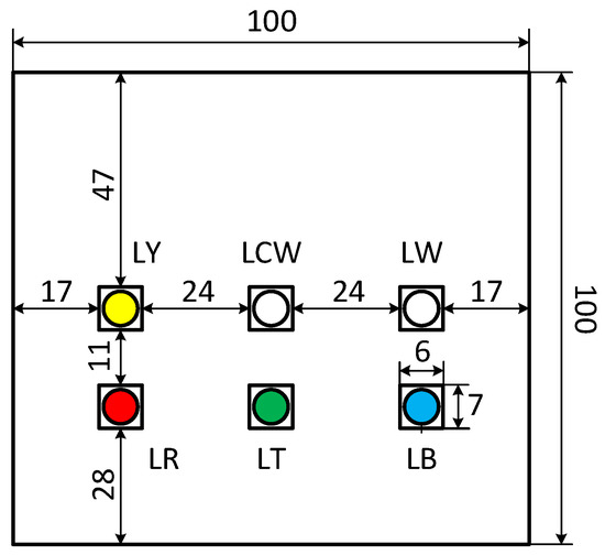 In the investigations, the mentioned diodes are mounted in the white surface packages produced from the recovered plastic material and soldered to a PCB of dimensions 100 mm × 100 mm and thickness 1.5 mm. This PCB contains an internal copper layer connecting the anodes of all the LEDs. The location of each of the considered power LEDs is shown in Figure 2.
