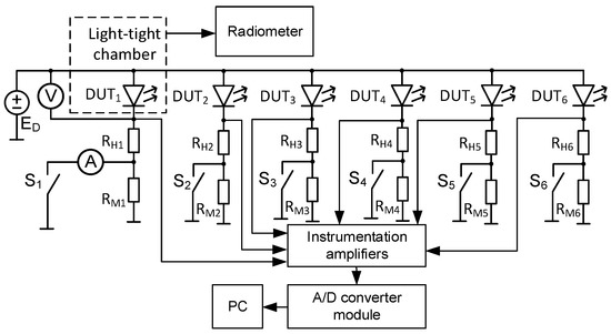In the set-up shown in Figure 3, ED is the power supply voltage. The investigated power LEDs are denoted as DUT1–DUT6. Resistors RH1–RH6 and RM1–RM6 are used to regulate the heating current IH and the measuring current IM of each diode, respectively. In measurement set-ups used to measure the internal temperature of semiconductor devices with indirect electrical methods, commonly presented in the literature [11,19,60], the main current of these devices in the form of a rectangular pulse train is obtained using two switched current sources. As is commonly known, it is impossible to construct a current source with a constant value of output current obtained in a wide range of voltages on such a source. Therefore, typically, such current sources are realised with the use of voltage sources and resistors, as shown in Figure 3. There are measuring devices with the ability to generate constant current over a wide voltage range, like Keithley 2400 and 2600, but these devices are expensive; the solution illustrated in Figure 3 is simpler and less costly.