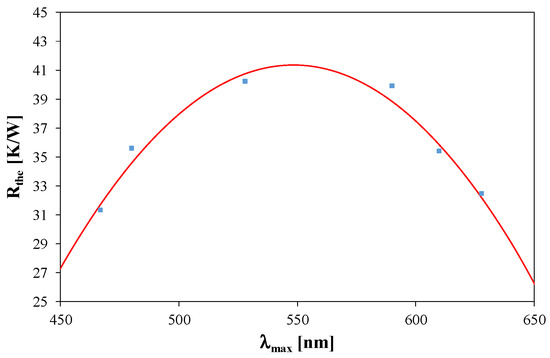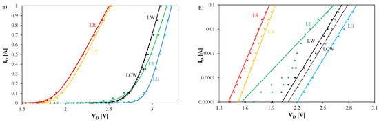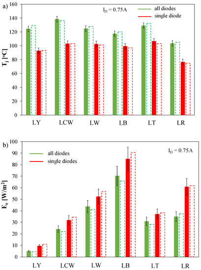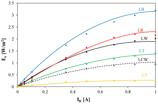 For the investigations, power LEDs of the type Golden DRAGON®, manufactured by OSRAM Semiconductor (Munich, Germany) were selected. These LEDs are dedicated for use in planes and cars [59]. They emit light of six different colours: LW (white), LB (blue), LT (green), LR (red), LY (yellow) and LCW (warm white). According to the catalogue data, diodes LCW, LB, LT and LW are made of gallium nitride (GaN), whereas diodes LY and LR are made of aluminium gallium indium phosphide (InGaAlP) [59].