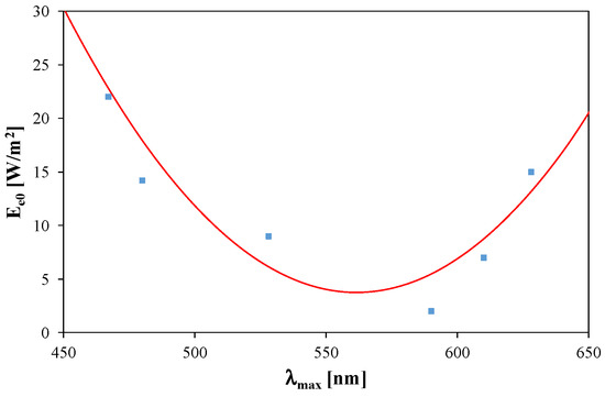 In turn, optical parameter values are estimated using the emission characteristics and measurements of the surface power density of the illuminated surface. The mentioned characteristics were approximated by means of the square function. Next, the values of the coefficients a, b and c occurring in Equation (5) are obtained using Excel software.