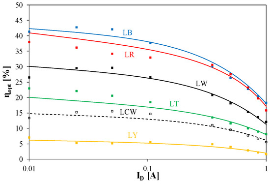 The study in [33] contains equations describing the dependence of luminous efficiency and luminous flux on the junction temperature and the electrical power dissipated in the diode. It is shown how to estimate the diode’s forward current at which the emitted luminous flux has the maximum value.
