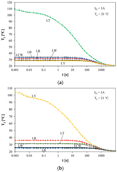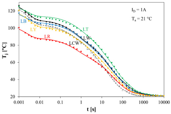 The results of the investigations shown in Figure 9 correspond to the operation of each and every power LED. For the investigations, the results of which are shown in Figure 9, the investigated PCB is situated inside a light-tight chamber of dimensions 400 × 250 × 220 mm3. In contrast, in Figure 10, the results of the investigations performed for the PCB lie on the table without a light-tight chamber. Due to the differences in the cooling conditions, the values of the junction temperature at the beginning of cooling (t = 0) visible in Figure 10 are lower than the values of this temperature visible in Figure 9.