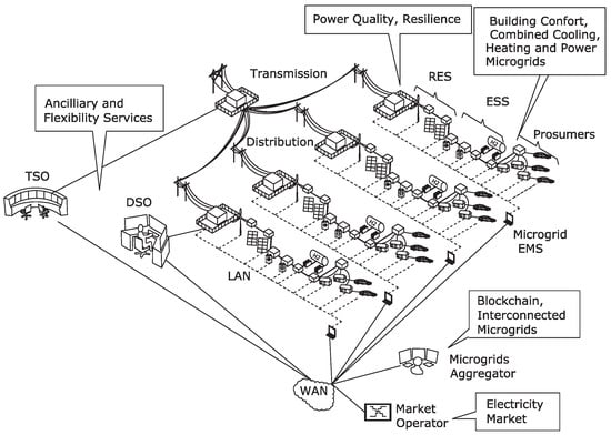 The quest for novel sources of flexibility has been one of the most relevant areas of research in the recent years [20,21,22]. Microgrids, prosumers, and the so-called DSM—demand side management/DR-demand response capacity have been consistently considered to be (one of) the most valuable new sources of adjustment between production and consumption, especially as the share of dispatchable (regulated) power plants, capable of offering power/energy reserves diminishes. Due to the small dimension (both of power capacity and energy volumes), a single prosumer or microgrid is of little value in assisting a transmission system operator (TSO) in maintaining the stability of the system. This is the main reason why different structures of operation, aggregation, and negotiation of electricity are requested together with the definition of new energy/electricity players and actors for the energy transition decade just started. Recent research [23] addressed the organization of prosumers in the form of resource aggregators (including their identification, classification and connection with other power system players) and characterized in detail the role of resource aggregators and the organization of new business models for demand response in electricity markets. With a different, but extremely valuable and innovative approach, Pasetti et al. [24] addressed the role of Virtual Power Plants and Demand-Side Management in Urban Energy Systems, with a focus on a VPP (virtual power plant) architecture with the capability of supervising the prosumer participation in DSM programs. Unlike classical VPP architectures that usually build on dispersed VREs, these authors focused on a VPP model constrained by the physical domain of single users, i.e., to single points of common coupling (Pcc) of the distribution network, i.e., under a microgrid structure. The VPP architecture proposed by Pasetti et al. [24] allows the integrated and coordinated implementation of several control and management strategies applicable to microgrids and clusters of consumers aggregates, e.g., energy management, demand response, and ancillary services and is a promising concept for years to come.