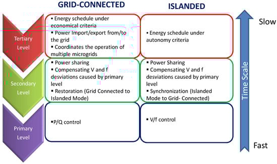 The primary level operates on a fast time scale and maintains the voltage and frequency stability during changes on the generation or demand, or after switching to the islanded mode. This control is implemented locally in the DERs. The secondary level is responsible for ensuring that the voltage and frequency deviations are adjusted to zero after a load or generation change is produced within the microgrid. This level is responsible for eliminating any steady-state error introduced by the primary control and is also used for synchronization with the grid during the transition from the islanded mode to grid connection. The tertiary control is used to optimize the power flow between the components of the microgrid and the main grid (or other microgrids) on large time scales (planning and schedule). A summary of the main goals of each control level of the microgrid depending on its working mode can be found in Figure 3.