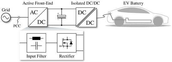 Schematic overview of an electric vehicle (EV) ultra-fast battery charger, with highlight of the active front-end (AFE) structure.