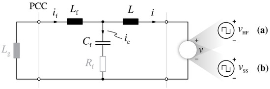 Due to its symmetrical three-phase properties, the considered model can be represented with the single-phase equivalent circuit illustrated in Figure 3. It must be noted that the low-frequency voltage sources of Figure 2 appear as short circuits, both from a high-frequency harmonic perspective (i.e., filter attenuation) and from a small-signal stand point (i.e., closed-loop control stability).