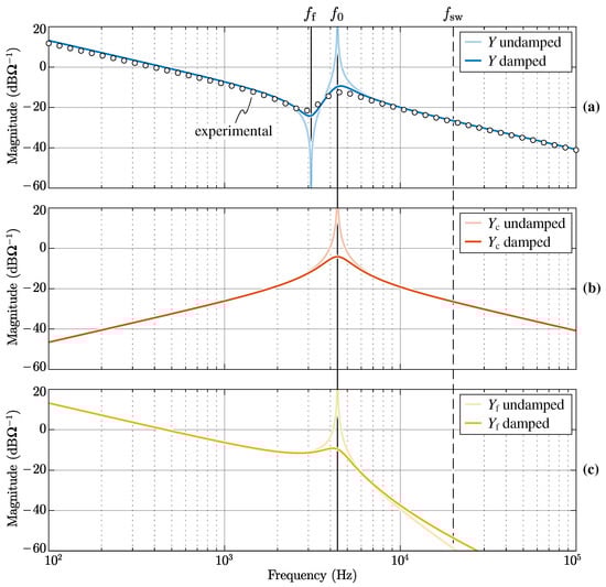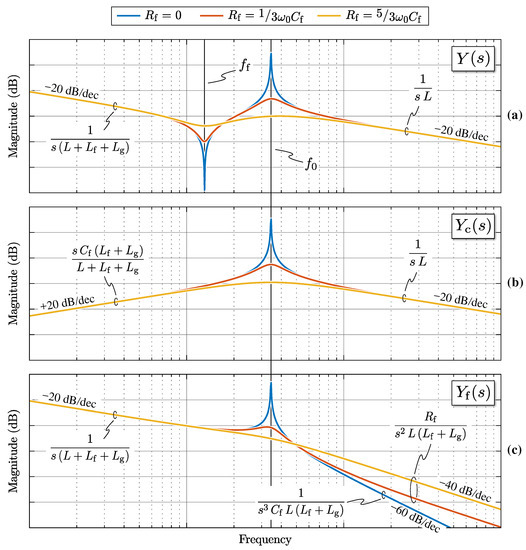 The admittance links the voltage applied by the converter to the generated (and controlled) converter-side current. This transfer function plays a key role in the closed-loop current control, affecting its performance and the system stability. The admittance allows to determine the current flowing into the capacitor branch, thus enabling the estimation of the power losses in the damping resistors (if any) and the voltage ripple on the filter capacitors. Finally, is the actual filter admittance, relating the high-frequency voltage components generated by the converter (i.e., ) with the current harmonics injected into the grid at the PCC. This transfer function determines the frequency-dependent filter attenuation and is thus essential for the LCL filter design. A qualitative representation of the magnitude Bode plots of , and is provided in Figure 4, where the effect of different damping resistance values is illustrated.