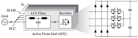 This work considers a modular UFC (consisting of N modules) connected to the European low-voltage grid (i.e., 50 , 400 line-to-line), schematically illustrated in Figure 7. Each of the N AFE modules consists of a 3-level unidirectional T-type rectifier and an LCL filter, both rated at 30 nominal active power. Notably, each module must ensure proper filtering at the PCC by itself, since the number of paralleled modules in one installation is generally not defined. The specifications and nominal operating conditions of a single converter unit are summarized in Table 1.