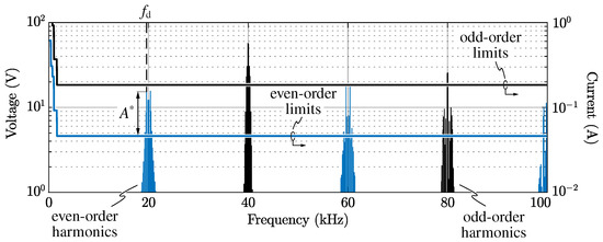 It is worth noting that, even though the averaged voltage waveform that is synthesized at the converter output is characterized by half-wave symmetry, the instantaneous PWM waveform is not, thus leading to the generation of both odd and even-order switching harmonics [56]. In particular, the generated harmonic orders can only be odd combinations of the carrier frequency (index m) and the fundamental frequency (index n):