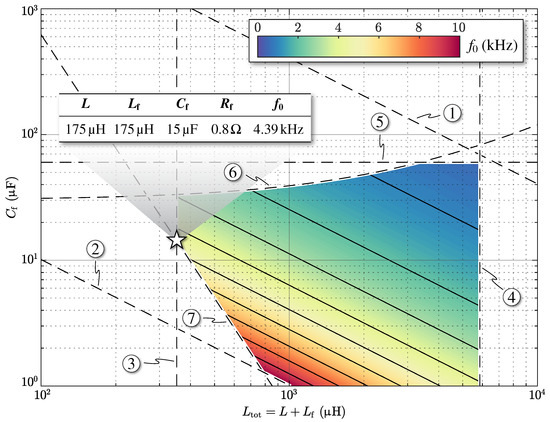 The proposed design methodology is based on translating the constraints ①–⑦ into boundaries in the filter design space (), so that the feasible design region can be identified. This representation allows to have a clear view of the available freedom for the filter optimization. Even though multiple different optimization criteria have been proposed in literature (see Section 2), in this work the feasible design with lowest total inductance is considered as the best candidate, since in low-voltage high-power applications inductive components dominate the overall filter size, cost and losses.