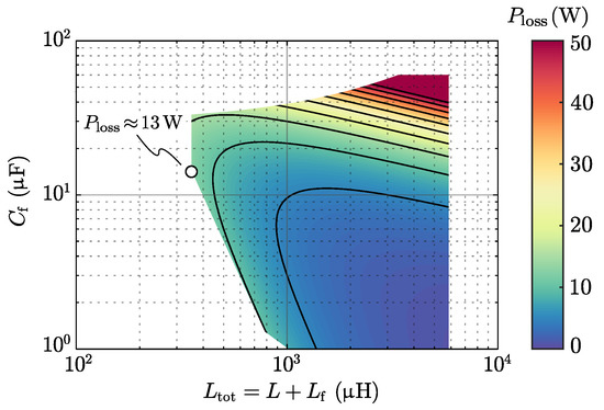 One design degree of freedom is removed by fixing the ratio between the grid-side inductance and the converter-side inductance at (i.e., ), according to the considerations reported in Section 2. As previously mentioned, this ratio allows to maximize the attenuation performance of the filter for a given amount of total inductance , thus representing a necessary condition for the filter size and loss minimization.