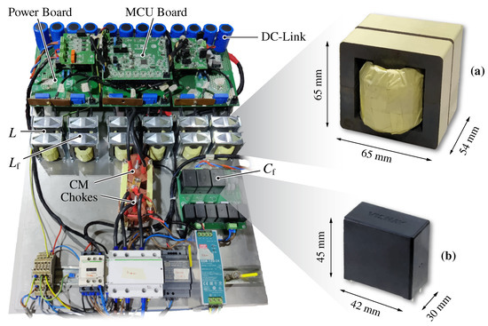 In general, the size of both inductive and capacitive components can be assumed to scale proportionally to their stored energy, respectively and [38]. Moreover, the energy storage density of inductors () and capacitors () typically differs by multiple orders of magnitude, being [38]. Therefore, it can be easily understood that in low-voltage () high-power () systems, as in the present case, the size of filter inductors largely dominates over the size of filter capacitors.