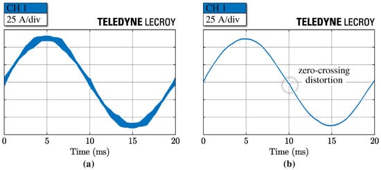 The low-frequency harmonic distortion, highlighted in Figure 17, depends on the converter load and is thus analyzed further. In particular, when operating at light load, the closed-loop current control is not able to perfectly compensate the large zero-crossing distortion related to DCM operation. This phenomenon leads to higher current THD at lighter loads, as illustrated in Figure 18a. It is important to keep in mind that the LCL filter is designed to comply with the operational constraints reported in Section 3, taking advantage of the AFE modular structure shown in Figure 7. Specifically, the converter modularity allows to turn-off selected modules at light load (i.e., ), thus ensuring the high-power operation of the remaining modules. Figure 18b shows that the current THD is limited below 5% between 20% and 100% of the nominal power (i.e., 6–30 ), achieving acceptable distortion over the complete design operating range of the converter module.