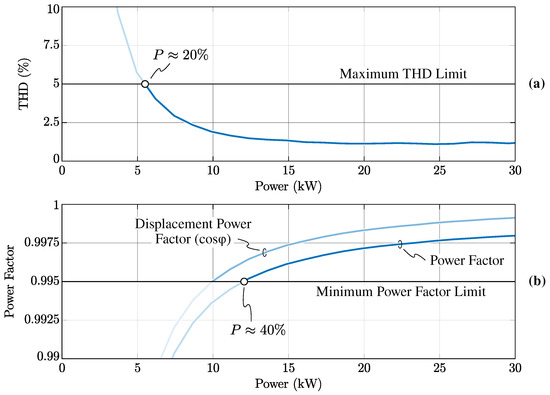 Another quantity affected by the converter load is the power factor, as illustrated in Figure 18b, where both the displacement power factor () and the total power factor (PF) are shown. The relation between the two is straightforward: