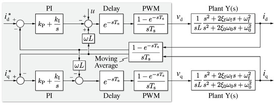 The digital implementation of the control introduces three main delay components, which reduce the achievable control bandwidth and/or decrease the closed-loop stability margin [23]. The first delay contribution is directly related to the digital processing, which generates one sampling period delay () between the measured quantities and the control signal output. The second component is linked to the PWM modulator, which introduces a zero-order hold (ZOH) effect with a duration. Finally, the last contribution derives from the current oversampling and averaging process, which results in a moving-average delay of . The complete dq current control block diagram is illustrated in Figure 20.