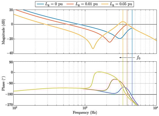 As previously mentioned, the grid inductance is generally not known during the filter design process. In fact, the converter installation location is usually undefined and it may witness large inductance variations during the day and/or along the year. In general, the converter control stability can be compromised by a weak grid with high inductive impedance and low short-circuit ratios (SCRs), as the filter resonance frequency decreases and may interfere with the controller bandwidth [52]. For this reason, a suitable margin must be considered during the filter design and the converter control tuning stages.