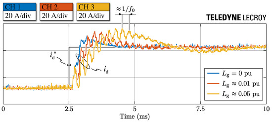 This is better highlighted in Figure 23, where the step response of the converter-side currents is reported on the d-axis of the rotating dq frame. The value of is obtained from the digital-to-analog converter (DAC) of the microcontroller unit (MCU), therefore it is discretized in time (i.e., with a periodicity) and is characterized by a large noise content. Figure 23 shows that higher grid inductance values cause at the same time a slower response (i.e., lower bandwidth), a higher overshoot (i.e., lower phase margin) and an increased high-frequency oscillation (i.e., lower gain margin at the phase cross-over frequency). All of these aspects could already be observed from the open-loop control transfer functions analysis previously reported (see Figure 21), nevertheless they have been verified experimentally.