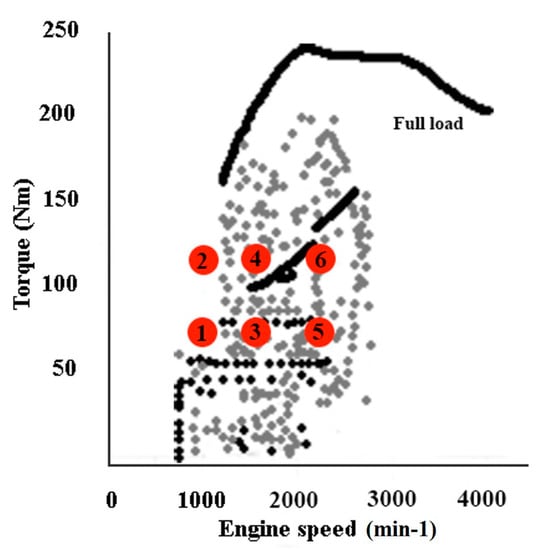 Provided that the test bench only worked under steady state operation (stationary regime vs. torque), testing was adapted to cover the most frequently used working conditions of a light duty vehicle, considering urban and extra-urban driving. Six steady state operation modes were selected [25]. These modes are included in the NEDC 19—equivalent representative transient working conditions, being the most representative ones. The New European Driving Cycle (NEDC) speed profile was translated into engine operating conditions in terms of torque-speed, resulting in the points shown in black color (Figure 2). Although some modes are outside of NEDC work map, they have been included in this study since they reproduce engine operating conditions established in the new standardization cycle (worldwide harmonized light vehicles test cycles, WLTC), represented by the grey dots (Figure 2) [25]. Table 4 shows the engine operation point tested considering the engine speed, torque and percentage of exhaust gases recirculation. The experimental steady-state condition modes started with the use of diesel fuel, followed by the fuel blends. To check whether the use of alcohol/diesel fuel blends affected engine behavior, a final test using pure diesel fuel (100%) was carried out. Tests started once temperature at exhaust pipe was stable, which indicates that the engine was running under stationary conditions. Each measure was repeated three times, and the average value was calculated.