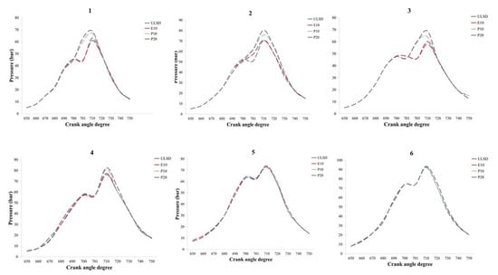 Cylinder pressure against crank angle for ultra-low sulfur diesel fuel (ULSD) and alcohol blends; Ex: x% ethanol; Px: x% propanol, for each studied steady state.