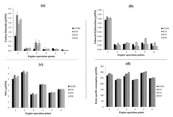 CO emissions (a), unburned hydrocarbon emissions (b), NOx emissions (c) and brake-specific fuel consumption (d) for each analyzed operating condition. Ultra-low sulfur diesel fuel (ULSD); ethanol 10% v/v; propanol 10% v/v; diagonal left fill: propanol 20% v/v.