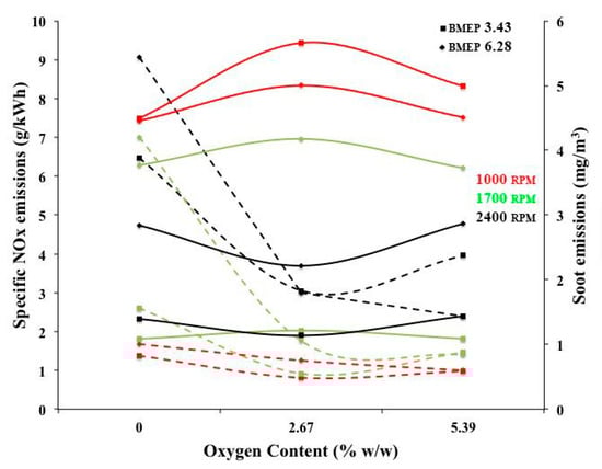 Fuel oxygen content v/s specific NOx (continuous line) and soot (discontinuous line) emissions for propanol/ULSD blends. BMEP (brake mean effective pressure).