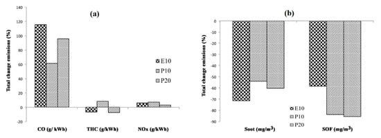 Total emissions of alcohol/diesel fuel blends compared to straight ultra-low sulfur diesel (ULSD) fuel. (a) CO (a), NOX and total hydrocarbon (THC) emissions; (b) soluble organic fraction (SOF) and soot emissions; alcohol blends: Ex: x% ethanol; Px: x% propanol.