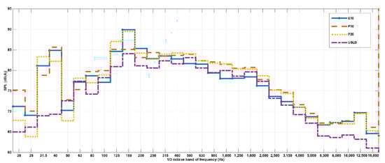 1/3 octave band of frequency for 10% ethanol blend (E10), 10–20% propanol blends (P10–P20) and ultra-low sulfur diesel (ULSD) fuel.