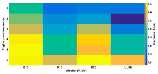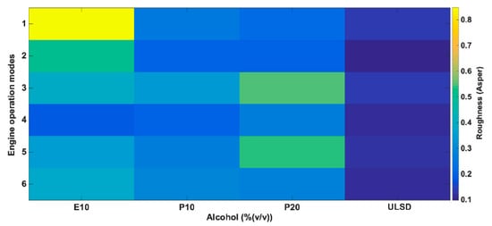 Figure 9 shows a roughness spectrogram. As may be seen, roughness level increases when the percentage of alcohol in the blend increases, this being especially noticeable under low loads (almost 0.8 asper). Traditionally, the feeling of power and sportiveness while driving a motorcycle or a car has been associated with roughness, although high values of this metric are indicative of unpleasant sound. Medium frequency vibration of powertrain is responsible for engine roughness, which is linked to an increase of radiated noise. Vibrations are caused by engine moving parts, e.g., crankshaft, camshafts, etc., which are inversely proportional to passenger comfort.