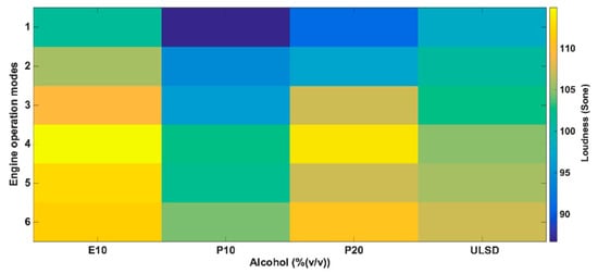 Sharpness and loudness show similar spectrograms (Figure 10 and Figure 11, respectively). The increase of both metrics is highly noticeable at high loads, around 8.5 acum and more than 110 sones for sharpness and loudness, respectively. Again, low CN of short carbon-chain alcohol (ethanol and propanol)/diesel fuel blends penalizes sound quality, so higher loudness and sharpness values are achieved. It may be explained provided that loudness increase produces annoyance and noise perception increase. In the same way, as mentioned above, sharpness corresponds to high frequency content, thus with perceived annoyance. When short carbon-chain alcohol/diesel fuel blends are used, sharpness increases under high loads. Comparing between alcohol fuel components, 1-propanol/diesel fuel blend has achieved a minimal deviation compared to diesel fuel.