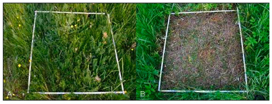 1 × 1 m square frame sampling plots before (A) and after (B) collection of grass samples.