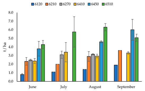 The assessment of the overall producible sugar quantity from one ha exhibited a high potential of 6510 which from all tested habitats had the highest productivity in all vegetation periods, and in June, more than 0.7 t of fermentable sugar per ha could be produced. Other habitats that have demonstrated high sugar yields had lower productivity, e.g., 6210 having only 0.45 t/ha in June (Figure 3, Table 3) and 6120 even having below 0.2 t/ha.