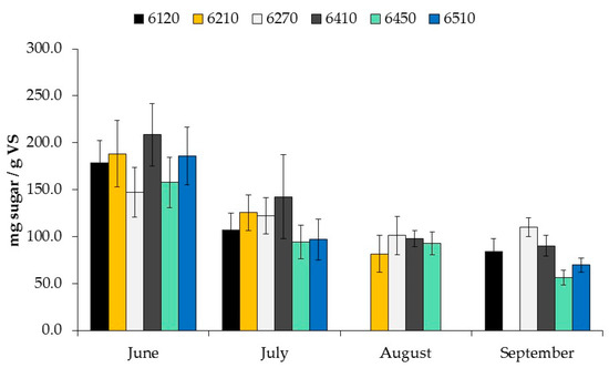 The evaluation of the vegetation period showed a strong decrease in sugar yields with increasing vegetation time (Figure 3). No significant decrease (p > 0.05) was observed only between the samples collected in August and September. Similar observations have been made for methane yields in biogas production, where the increase in crude fiber at the end of the vegetation period has been set out as one of the main factors influencing the methane production [38]. Others have pointed out that to grasses harvested after October, an extra carbohydrate source must be added if applied for energy production purposes [36]. No influence of specific habitat type has been observed or recorded previously.