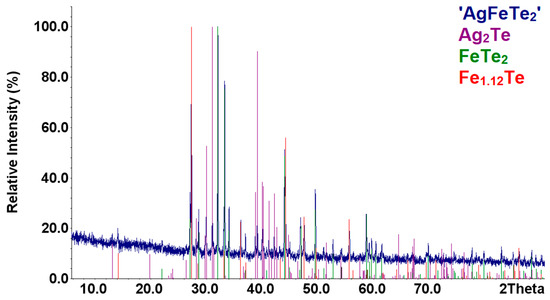 Samples of the compounds ‘AgFeTe2′ were synthesized with the methods described in Section 2.1. According to results of XRD analysis, composition of these samples are identical and consists mixture of the Ag2Te [57], FeTe2 [58], and Fe1.12Te [41] compounds (Figure 1). Increasing the annealing time to 3 weeks did not change the samples’ diffraction patterns. Therefore, there are no indication of the formation of the AgFeTe2 compound under the conditions in the synthesis and annealing of the samples in vacuum ampoules, similar to Refs. [13,14,15].