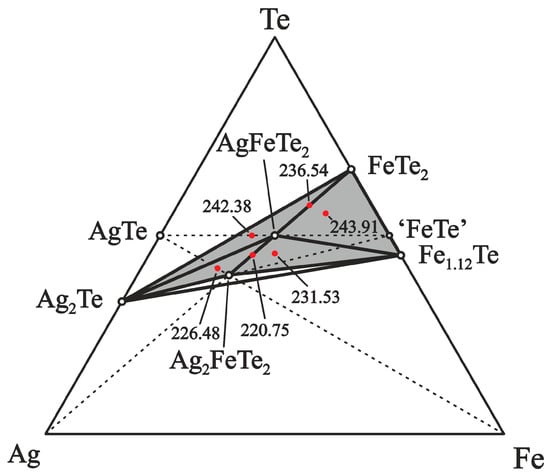 As in the case of the study of formation of equilibrium phase in the Se-Ag–Fe system [28], we analyzed the possibility the existence of AgFeTe2 and Ag2FeTe2 compounds in the equilibrium phase space of the Ag–Fe–Te system. The compositions AgFeTe2 and Ag2FeTe2 lay at the intersection points of the tie-lines AgTe–‘FeTe’, Ag–FeTe2, and Ag2Te–‘FeTe’, Ag–FeTe2, AgTe–Fe, respectively. According to Goryunova [59], ternary compounds are formed at the cross of the sections between binary compounds or binary compounds and elements.