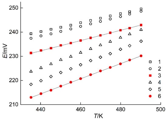 The measured EMF values of the ECCs at various temperatures are presented in Table 5 and plotted in Figure 6. These data were used to calculate the coefficients and dispersions of Equation (9) for the phase regions (IV) and (V). Results of calculations are listed in Table 6.