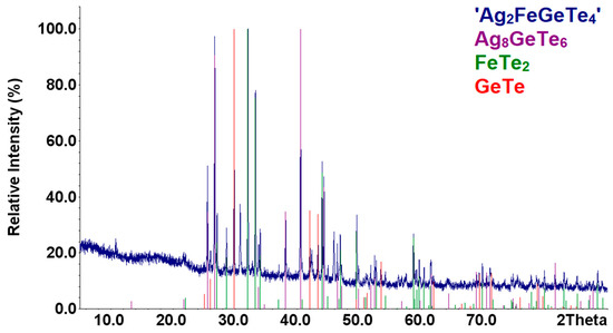 The samples of the formula composition ’Ag2FeGeTe4′ were obtained by both methods described in Section 2.1 above. For both samples, the diffraction patterns are identical (see Figure 4). The presence of the phases Ag8GeTe6, FeTe2, GeTe, and impurities of the fourth unidentified phase in the samples was identified by XRD. Heat treatment of the finely disperse mixture of the phases in vacuum and in the range between 450 and 600 K did not affect samples’ phase composition.