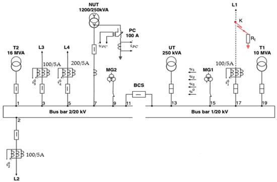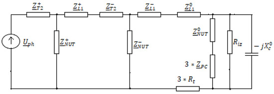 In the scheme in Figure 4, the plus-sequence and minus-sequence impedances of own service transformer (UT in Figure 1) were neglected because they had values much higher than the zero-sequence impedance (Table 1). Additionally, the ground impedances (transverse impedances) on the plus and minus sequences of the 20 kV network were neglected because they had much higher values than the longitudinal ones.