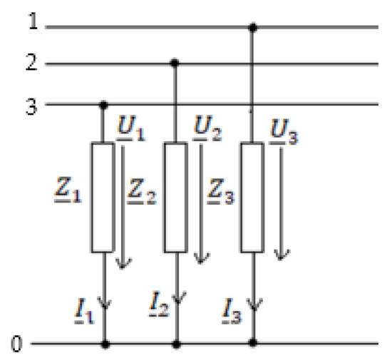 Figure 2 shows an asymmetric three-phase element in which U1, U2 and U3 are the phase voltages represented in the complex, are the phase currents represented in the complex, and are the phase impedances represented in the complex. The sequence voltages as a function of the phase voltages are expressed by the relations [23,24,25],