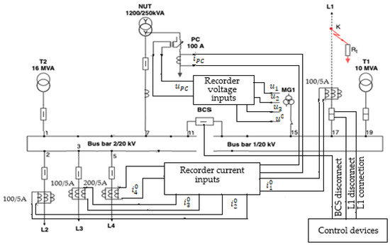 The results obtained by calculation were experimentally verified in a real 20 kV mains. Figure 5 shows the diagram of the 20 kV network, the transformer substation and the parameters recorded using a data acquisition system. Figure 5 shows how the data acquisition system and the recording equipment were connected to the measuring groups in the substation. The following parameters were recorded during the fault: