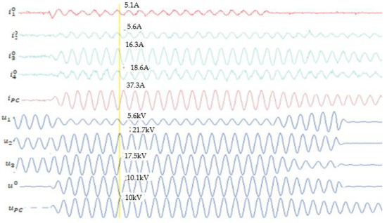 From the oscillogram shown in Figure 7, when Rt = 1100 Ω, the transient component, both in the current line with fault and in the currents of the lines without defect, was much smaller. For this reason the waveforms of currents were practically sinusoidal. The voltage waveform, both in the oscillogram from Figure 6 when Rt = 8 Ω, as well as in the oscillogram in Figure 7 when Rt = 1100 Ω, was sinusoidal, a hypothesis that was accepted in the analytical calculation of the fault current. The values of currents and voltages during the single-phase-to-ground fault obtained from the measurements in the real network of 20 kV are presented in Table 11.