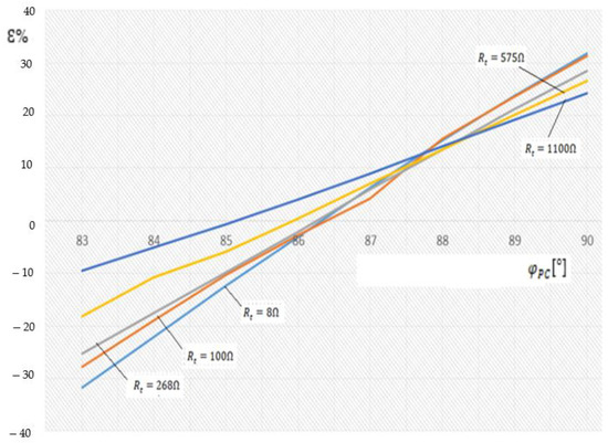 Figure 8 shows the difference between the measured value () and the calculated value () of the fault current, depending on the phase difference between the voltage and current () of the Petersen coil (), considering the real insulation for electrical networks was 20 kV and the difference phase between and was 85.3°. In this case, the active component of the total capacitive current was no longer zero.