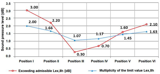 When assessing the compliance of working conditions with the requirements at selected workstations, it can be concluded that the maximum A-noise level (LAmax) and C-noise peak (LCpeak) do not exceed the value limit, while the level of noise exposure for 8 h work (Lex,8h) exceeds the value limit at each of the six analyzed workstations at the mechanical coal processing plant (Figure 2).