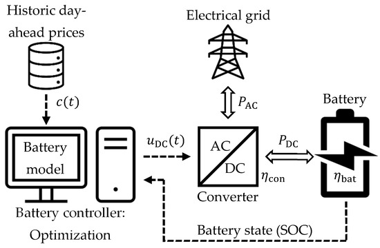 Renewable energy sources, such as solar and wind, have transient properties due to weather and seasonal conditions [6]. In parallel, demand patterns are hard to predict, especially for the transportation sector with the uncontrolled charging of electric vehicles [7]. The resulting fluctuations do not necessarily match the generation on the supply side [8]. Therefore, additional buffer capacities in the form of energy storage systems are needed to ensure grid operation [9]. Grid imbalances are traditionally atoned for by large infrastructures such as hydropower plants. Such large solutions remain expensive and cannot be installed everywhere due to territorial limitations [10]. Storing energy in stationary buffers such as battery energy storage systems (BESSs) in combination with modern computational methods for flexibility control is a promising avenue, since BESSs can be implemented almost anywhere in the grid. Such storage systems can be used autonomously, mostly as a small-scale unit such as in [11,12], or in an aggregated form, clustered, for example, in a virtual power plant in combination with other distributed energy resources [13,14]. In the case of autonomous optimization, the storage systems are individually controlled on-site, while in the case of a virtual power plant, the storage systems in the cluster are controlled centrally. In the latter case, BESSs would require a two-way communication to upload control commands and download measuring data [15]. Autonomous control requires only unidirectional communication where an incentive is transmitted. This control method has been shown to be a robust and cost-effective alternative to centrally controlled approaches [16]. BESSs in general have been proven to be a suitable measure for grid balancing purposes [17,18,19] but remain expensive [20].