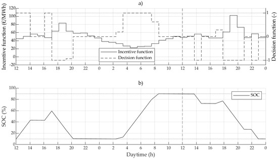 Exemplary day-ahead stock market price-based battery operation for 36 h. The battery operation is calculated for the day-ahead price for the United Kingdom, starting at noon on 1 January 2015 until midnight on 2 January 2015: (a) day-ahead price (incentive function) and resulting decision function, (b) corresponding battery state of charge.