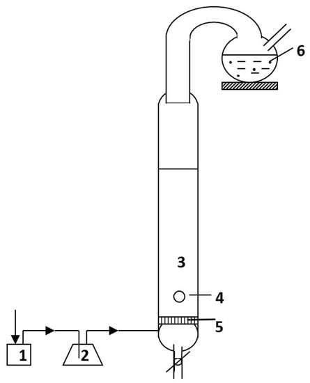 Scheme of ion flotation apparatus. 1—gas flow regulator, 2—aqueous scrubber, 3—flotation column, 4—injection capable valve (for collector), 5—sintered glass sparger, 6—foam receiver.