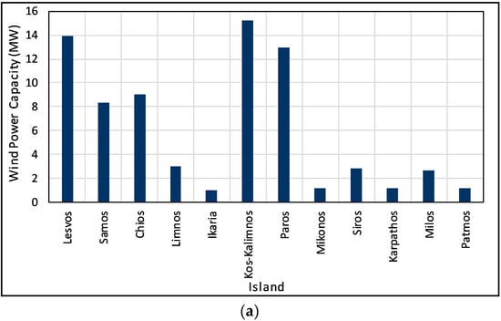 (a) Installed wind power capacity; (b) PV power capacity in NIIs of the Aegean Archipelagos.