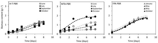 The photobioreactors were operated in two successive years of 2018 and 2019. The microalga C. pyrenoidosa was cultivated in two distinct growth media: in full BG-11 medium (under nutrient sufficiency) in 2018 and in BG-11 medium with 10-times reduced nitrogen content (under N limitation) in 2019. Growth of biomass under nutrient sufficient conditions in MTA, H-T and FPA PBRs is summarized in Figure 2. In MTA PBR, the slowest growth of C. pyrenoidosa was detected in July when the biomass content increased from 0.31 to 0.52 g L−1 after 8 days of cultivation. The fastest growth was detected in October when the biomass content increased from 0.36 to 1.90 g L−1 after 8 days (doubling time in exponential phase was TD = 1.7 days). In H-T PBR, the slowest growth was detected in September when biomass increased from 0.13 to 1.29 g L−1 after 8 days (TD = 2.2 days), while the fastest growth (TD = 1.2 days) was determined in June; however, with a very similar biomass increase as in September (biomass increased from 0.08 to 1.28 g L−1 after 8 days). The difference in growth rates between June and September was related to potentially higher maximal populations size K, as derived from data interpolation by the logistic function (K = 1.27 and 4.50 g L−1 for June and September, respectively, for details of K determination see Equation (1)). The lowest variation in growth throughout 2018 was detected in FPA PBR: TD was detected as 1.52–1.94 days in January and May, respectively. The biomass increased from 0.24 ± 0.07 to 1.84 ± 0.11 g L−1) after 8 days (Figure 2).
