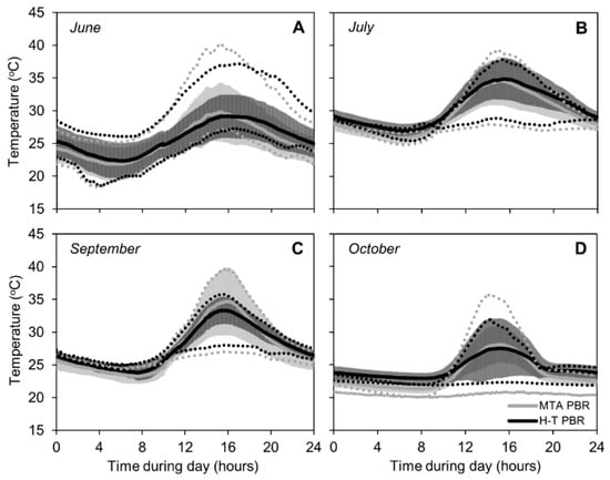 Temperature profiles in H-T PBR (black lines) and MTA PBR (grey lines) in June (A), July (B), September (C), and October 2018 (D). The full lines represent averages from 8 days of cultivation in each photobioreactor, the dark and light grey error intervals represent standard deviations for H-T PBR and MTA PBR, respectively. The doted lines represent temperature profiles in days when minimal and maximal temperatures during the light phase of the day were detected (within each month). Temperature in FPA PBR was regulated to 25 °C.