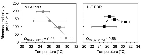 Temperature dependence of biomass productivity in MTA PBR (left panel) and H-T PBR (right panel) under nutrient sufficiency. Each point represents average daily temperature as measured during 8 days of C. pyrenoidosa cultivation in June, July, September and October 2018, error bars represent standard deviations. Biomass productivity was determined from a single point measurement at 8th cultivation day, data of C. pyrenoidosa growth are summarized in Figure 2. Temperature coefficient Q10 was calculated according to Equation (2).